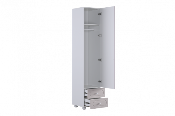 Модуль оснащён одной распашной дверцей и двумя вместительными выкатными ящиками в нижней части, предназначенными для хранения одежды, текстиля или аксессуаров. Внутреннее наполнение можно выбрать в зависимости от потребностей: шкаф может быть укомплектован полками или штангой для плечиков, что делает его удобным для хранения как сложенных вещей, так и одежды на вешалках.