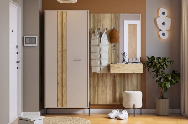 Принт, имитирующий вертикальную фрезеровку придает вешалке уникальный и современный вид, добавляя текстуру и глубину. Материал вешалки – ЛДСП, что обеспечивает прочность и долговечность, а также легкость в уходе.